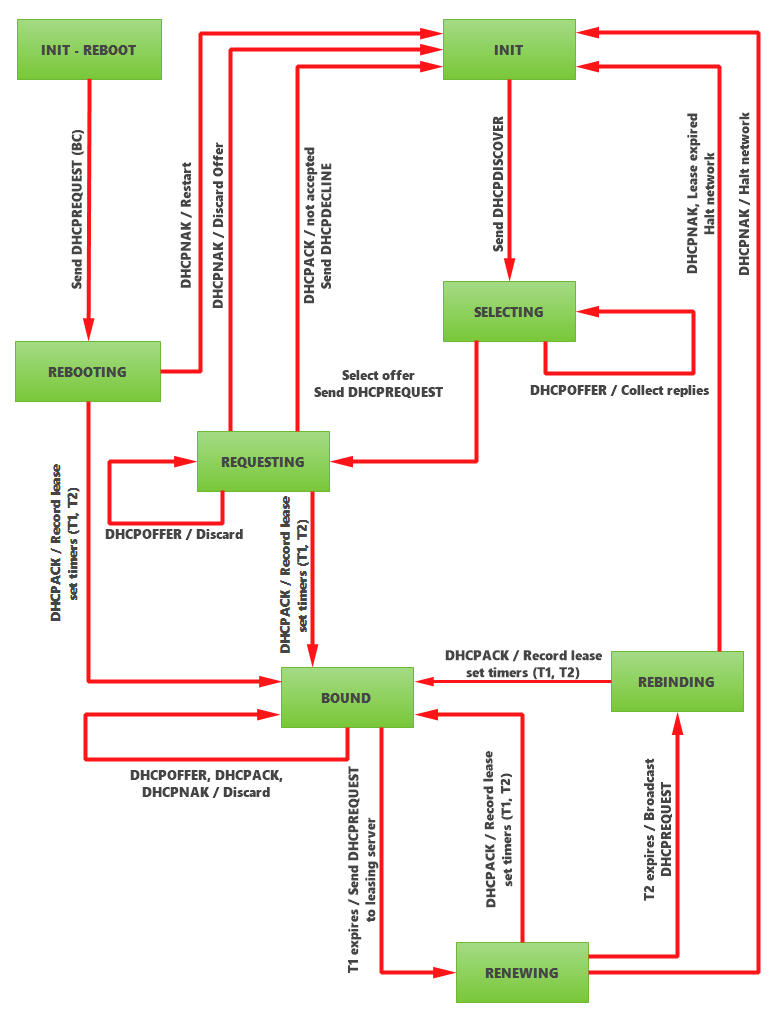 Kad računalo ili drugi uređaj (smartphone, printer, smart TV…) spojimo na novu mrežu, (žičanu ili bežičnu) pod uvjetom da već nema upisanu fiksnu adresu, pokreće se mehanizam traženja IP adrese i ostalih parametara potrebnih za njegovo funkcioniranje na mreži, takozvano INIT stanje IP adresa identificira uređaj na mreži i omućuje mu lokalni pristup te pristup internetu. Procedura dodjele IP adrese kreće tako da uređaj na broadcast adesu mreže pošalje zahtjev koji zovemo DHCPDISCOVER a traži da mu se javi DHCP server koji je voljan dodijeliti IP adresu. Ako takav server na mreži postoji i ispravno je podešen, nakon primitka spomenutog zahtjeva odgovorit će sa DHCPOFFER porukom koja porvrđuje postojanje DHCP servera i raspoloživih IP adresa na njemu. Ukoliko klijent želi prihvatiti ponuđenu uslugu šalje DHCP serveru poruku DHCPREQUEST da bi rezervirao IP adresu, a server odgovara sa DHCPACK potvrdom i dodjelom adrese na određeno vrijeme. Ograničeno vrijeme „najma“ adese osigurava da će klijent nakon njegovog isteka provjeriti sa DHCP serverom ima li kakvih promjena u konfiguraciji. Moguće je, naravno, da je server podijelio sve raspoložive adrese pa će u tom slučaju zahtjev DHCPREQUEST odbiti sa DHCPNACK porukom nakon čega se uređaj vraća u INIT stanje.