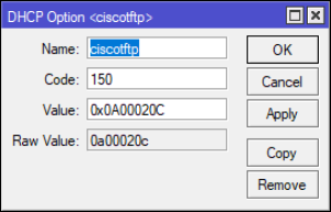 /ip dhcp-server option add code=150 name=ciscotftp value=0x0A00020C