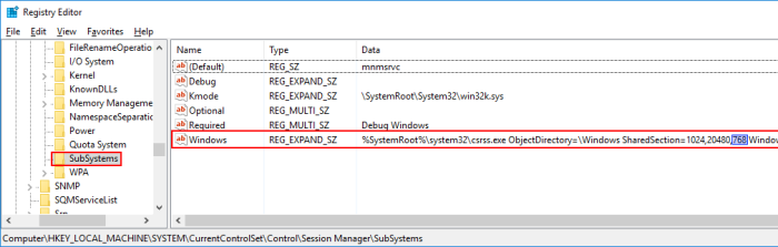 HKLM\SYSTEM\CurrentControlSet\Control\Session Manager\SubSystems